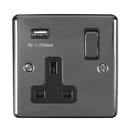 The Revive 1 Gang Switched Socket with USB features rounded edges for a contemporary look. Made from high quality materials, this accessory is styled in a modern design and has an Black Nickel finish.
