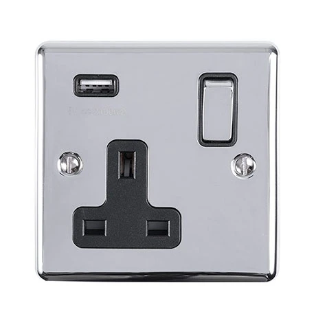Revive 1 Gang Switched Socket with USB – Polished Chrome