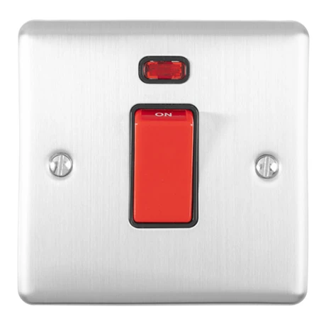The Revive 45 Amp Switch with Neon Power Indicator features raised rounded edge, designed to give a contemporary look. Made from high quality materials, this accessory is styled in a modern design and has a satin stainless steel finish.