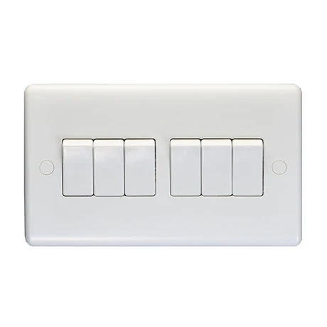 The Revive 6 Gang 2 Way Light Switch features rounded edges for a contemporary look. Made from high quality materials, this accessory is styled in a modern design and has an White finish.