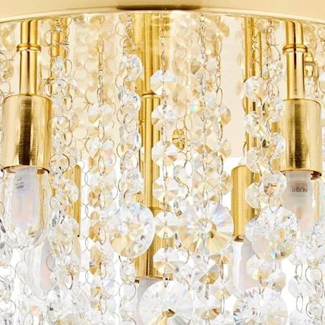 This Revive 9 light flush ceiling fitting features a round design ceiling plate in a brass finish with an array of stylish crystal droplets. This captivating light fitting will add a contemporary edge to any bathroom and is IP44 rated.