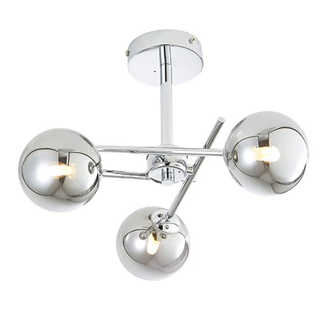 The Revive 3-light bathroom ceiling light is a stylish and contemporary bathroom light. It features a polished chrome ceiling plate with a cross arm design and smoked glass sphere shades. The light takes 3 x G9 LED lamps for ease of replacement. Its IP44 rating makes it suitable for use in the bathroom.