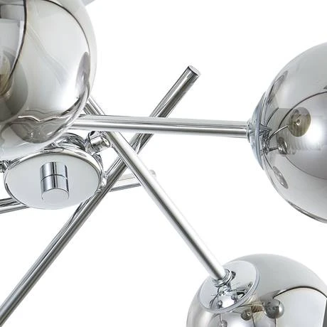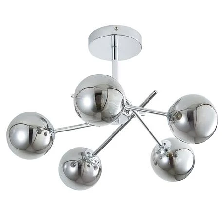 The Revive 5-light bathroom ceiling light is a stylish and contemporary bathroom light. It features a polished chrome ceiling plate with a cross arm design and smoked glass sphere shades. The light takes 5 x G9 LED lamps for ease of replacement. Its IP44 rating makes it suitable for use in the bathroom.