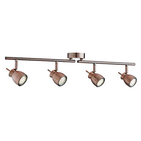 Instantly eye-catching, this Revive copper spotlight bar is a striking kitchen lighting solution that will amplify the style of any contemporary space. A gorgeous 4 light antique copper spotlight bar featuring two evenly spaced arms; each adorned with two adjustable spotlights.