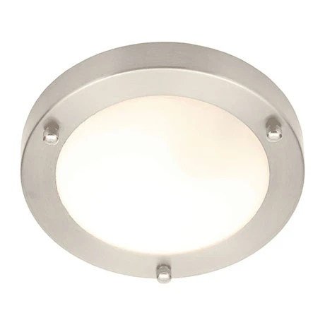 The Revive small LED flush bathroom ceiling light is a stylish light fitting ideal for the modern bathroom. It features a satin nickel finish round ceiling plate and a domed opal glass shade. Its IP44 rating makes it suitable for use in the bathroom.